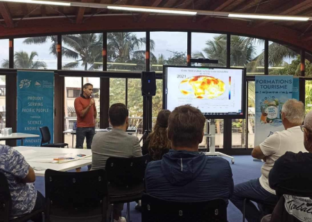 Pour aborder ce sujet, nous avons fait appel à Thomas ABINUN de Météo NC pour une présentation des données scientifiques météo en nouvelle Calédonie et dans le monde , Hubert GERAUX de WWF sur la question de “challenger le tourisme calédonien” et Soizic FLEURY pour une introduction à la fresque Océane.