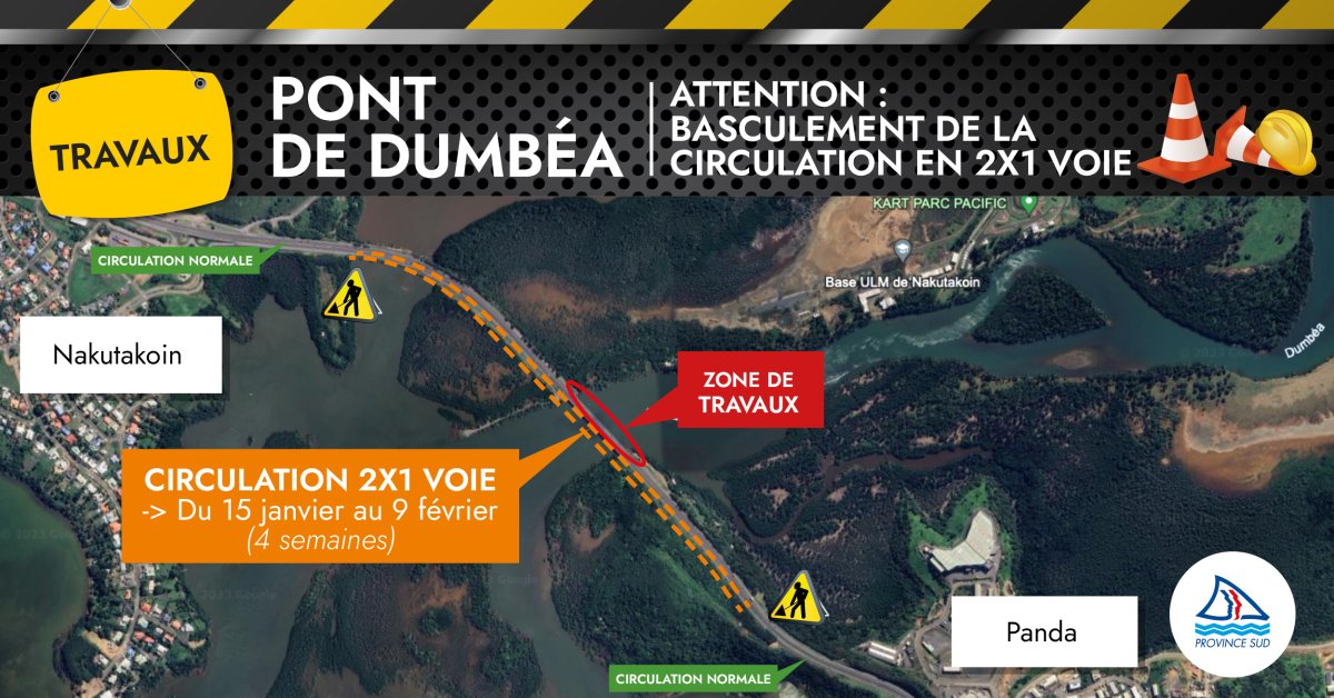 Travaux réalisés de jour à compter du 15 janvier puis basculement de la circulation en 2×1 voie en continu, de jour comme de nuit, à compter du 20 janvier au droit du pont de Dumbéa.