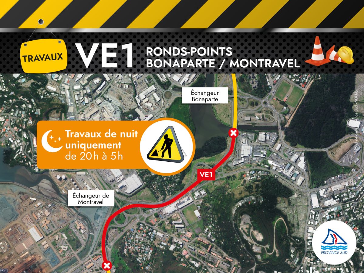 La province Sud vous informe que cette opération, inscrite au programme pluriannuel d’investissement (PPI), concerne une portion de la VE1 comprise entre l’échangeur Bonaparte (Rivière-Salée) et celui de Montravel.
