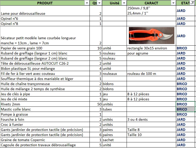 Consultation pour divers équipements de jardinage et de bricolage dont le listing des produits et quantité est à télécharger ci-après.