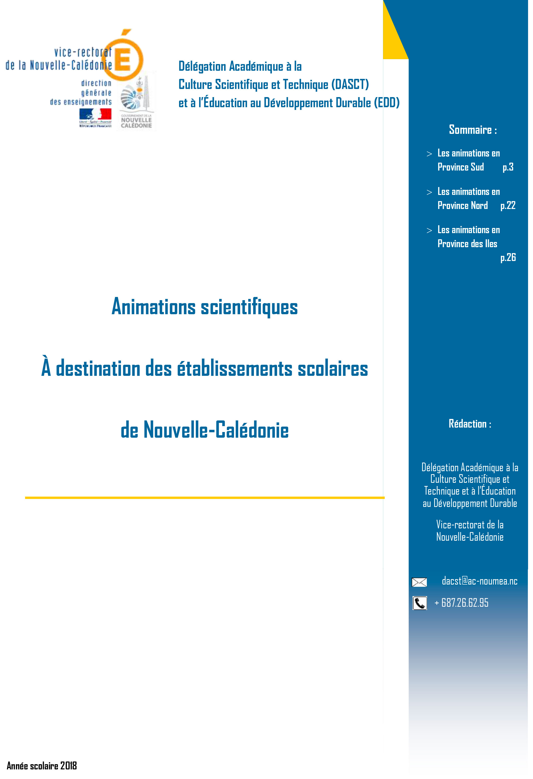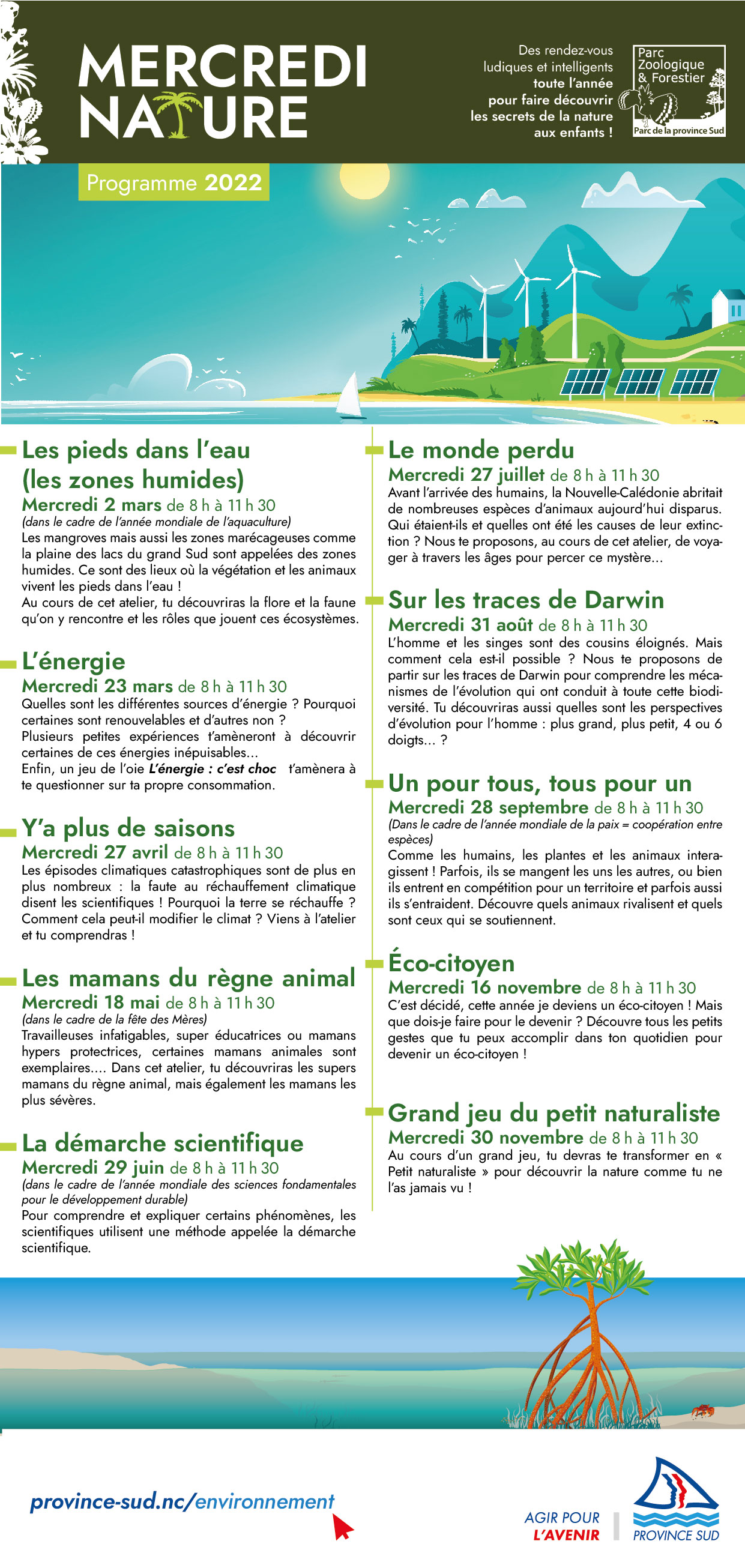 En partenariat avec le Vice-Rectorat, la Direction de l’enseignement de Nouvelle-Calédonie (DENC) et la Direction diocésaine de l’école catholique (DDEC), elle soutient et/ou pilote différents dispositifs en milieu scolaire et hors milieu scolaire telles que les aires éducatives environnementales, les classes vertes au Parc Provincial de la Rivière Bleue ou encore l’organisation d’ateliers lors des mercredis nature au Parc Provincial Zoologique et Forestier.