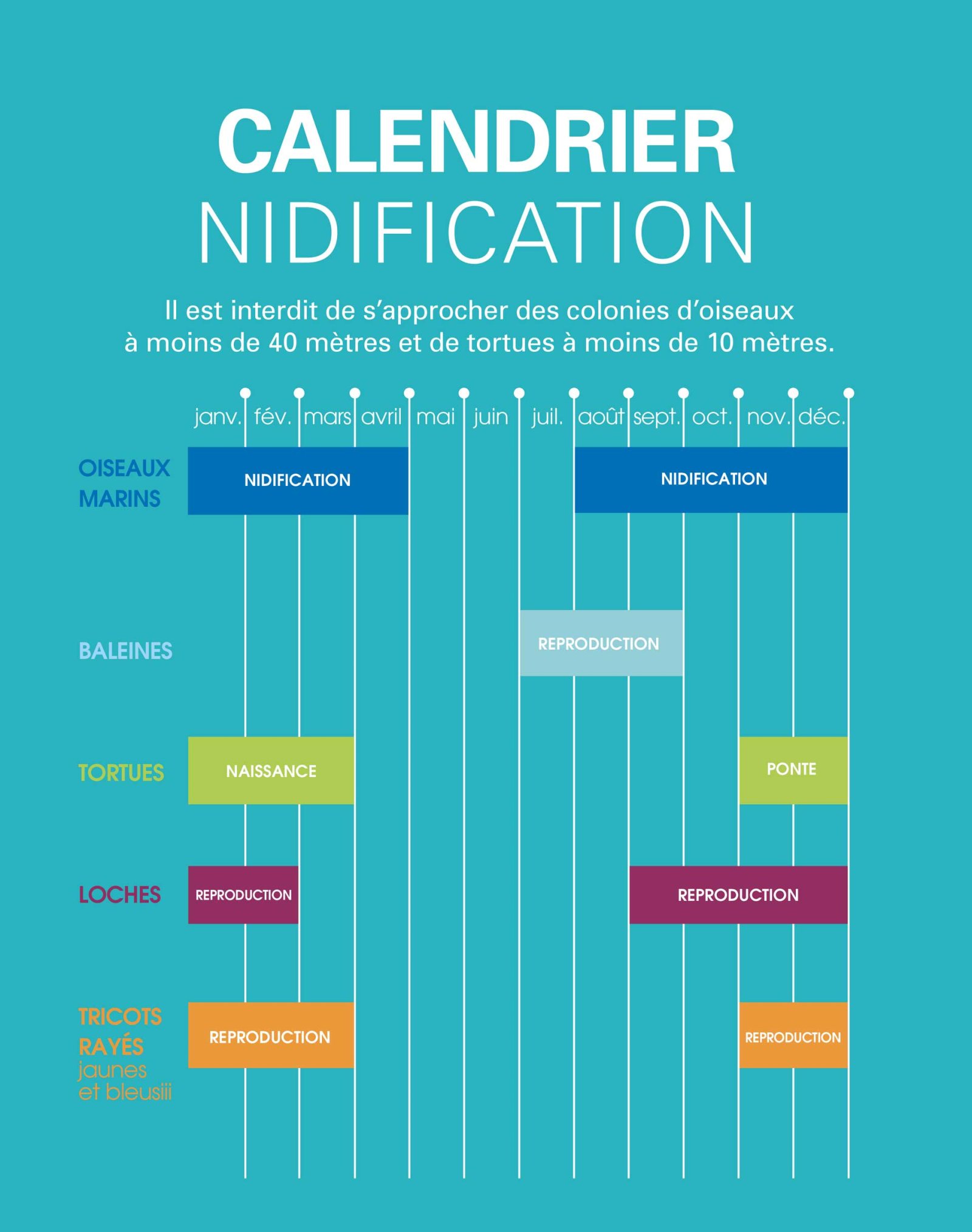 Lors des périodes de pontes et nidification, il est interdit de s’approcher des colonies d’oiseaux à moins de 40 mètres et de tortue à moins de 10 mètres.