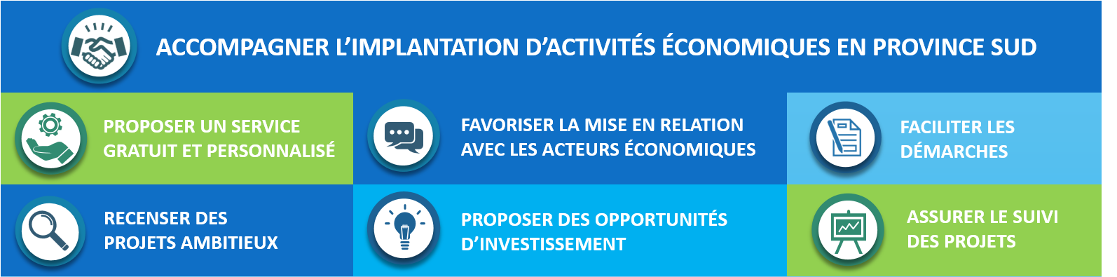 Le Bureau des Investisseurs en province Sud a pour but de promouvoir et renforcer l’attractivité économique de la province Sud auprès des investisseurs. Il diffuse des informations ciblées et à fort intérêt pour les investisseurs étrangers et les porteurs de projets en quête d’informations nécessaires sur l’investissement et l’implantation d’activités économiques en province Sud.