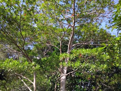 Feuilles papyracées, brillantes, échelonnées sur les axes, étroitement elliptiques (7-22 x 1,5-5 cm), aigües au sommet, en coin à la base ; marge régulièrement serretée sauf vers la base ; nervures à peine visibles ; pétiole plat, un peu ailé, 0,6 – 1,5 cm. Les feuilles âgées deviennent d’un rouge vif avant de tomber.