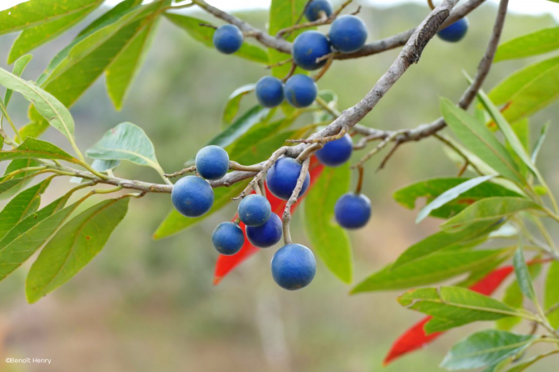 Fruits en drupes bleu vif à maturité. Mésocarpe fibreux. Noyau marqué de 4 – 5 sillons à surface verruqueuse. Particulièrement appréciés par les oiseaux (notous, colliers-blancs…), les roussettes.