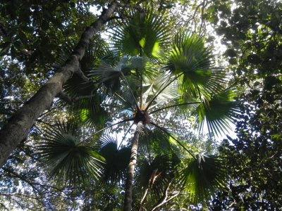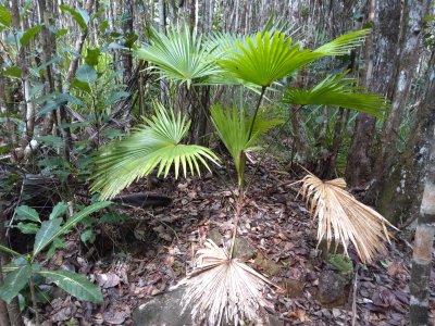Palmier pouvant atteindre 15 à 20 m de haut avec un tronc lisse de 15 cm de diam., évasé en disque à la base, laissant apparaître une collerette de racines.