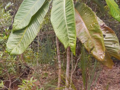 Feuilles très grandes, courtement pétiolées, peu coriaces et souples, 90 – 150 x 24 – 40 cm, nervures fortement saillantes.
