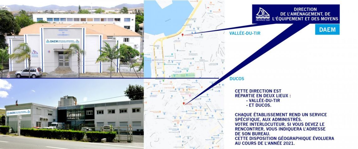 La direction de l’Aménagement, de l’Équipement et des Moyens (DAEM) de la province Sud met en œuvre l’ensemble des politiques provinciales sur les champs de l’aménagement du territoire et de l’urbanisme, de la protection et de la mise en valeur du foncier provincial, tant public que privé, du développement et de l’entretien des infrastructures de transport, routières, maritimes et aéronautiques. Pour le compte de l’ensemble des directions provinciales, elle construit et assure le gros entretien des bâtiments accueillant les différents services publics provinciaux, et apporte un soutien logistique au travers d’une gestion des moyens centralisée.