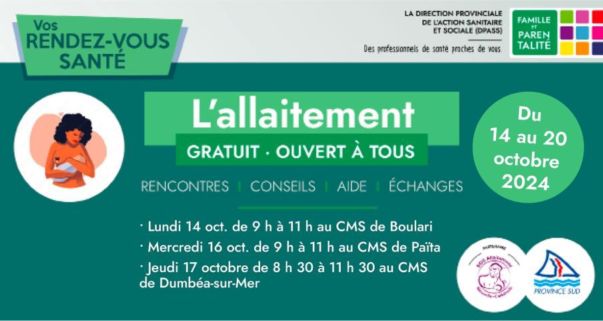 À l’occasion de la semaine de l’allaitement, la province Sud en partenariat avec l’association SOS allaitement propose 3 rendez-vous gratuits et ouverts à toutes et tous pour échanger. Cette année, le thème retenu est « Réduire les inégalités : soutenir l’allaitement pour tous ».