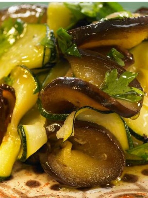 5. Dans un saladier, déposer les aubergines et les courgettes, les oignons, l’ail, le hachis d’herbes, arroser avec la sauce et mélanger. Couvrir et garder au frais jusqu’au moment de servir.