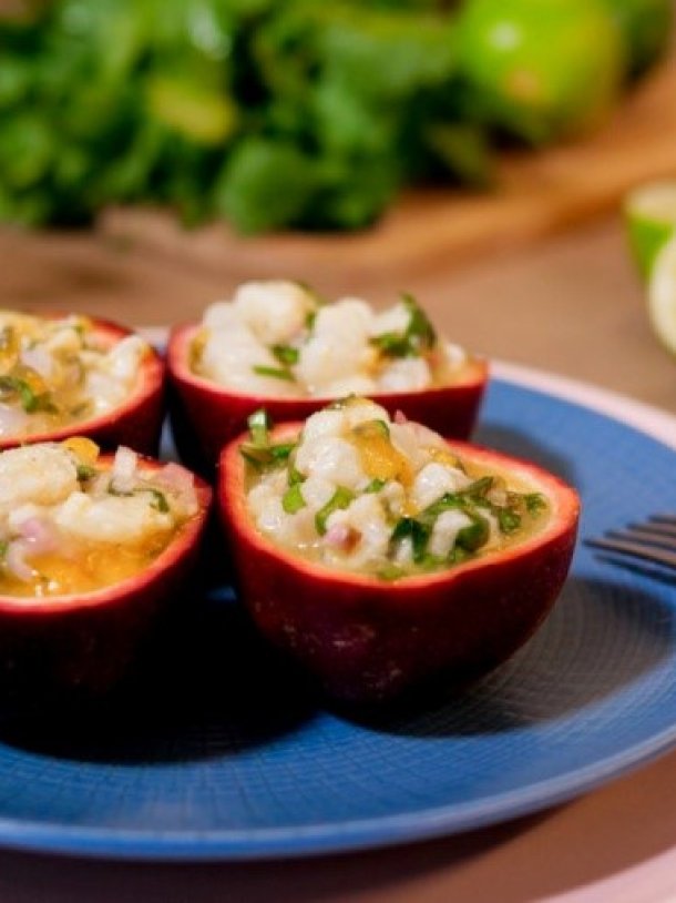 Dans un saladier, mélanger le poisson avec le gingembre et le persil chinois. Saler et poivrer. Ajouter l’huile et la pulpe de passion. Ajouter éventuellement le jus d’un citron ou d’un demi-citron (attention si les pommes liane sont assez acides éviter de rajouter encore du citron).