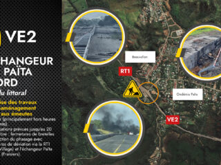 le 18/12/2025 Actualité Travaux sur la VE2 pour une durée de 6 semaines À partir du 4 septembre, la province Sud informe les usagers qu’un chantier impactera fortement la circulation sur la VE2. Sont concernées les zones de l’échangeur de Païta-Centre (Fraisiers), la Zipa...