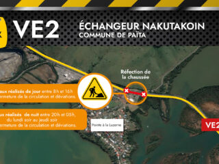 le 18/12/2025 Actualité Échangeur de Nakutakoin, information circulation Le chantier dans son ensemble Vous utilisez la VE2 et particulièrement l’échangeur de Nakutakoin ? Cette information vous concerne. Nature des travaux : Création d’un cheminement pour piétons. R...