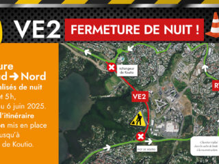 le 12/12/2025 Actualité Réfection des chaussées sur la VE2 Le chantier entre dans une nouvelle phase du 21 mai au 6 juin. La VE2 dans le sens Sud/Nord, sera fermée de 20 h à 5 h chaque nuit jusqu’au 6 juin. Une déviation (via Auteuil et Koutio) est mise en pl...