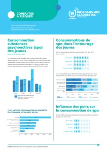 Consommation substances psychoactives (spa) des jeunes Dans les 30 derniers jours Consommations de spa dans l’entourage des jeunes Influence des pairs sur la consommation de spa CONDUITES A RISQUES La comparaison de l’enquête avec celle du Baromètre Santé Jeunes (BSJ) 2019 sur la tranche d’âge des 13-15 ans montre une baisse de la consommation de cannabis (14% vs 16%) mais une hausse des consommations de tabac (+1 point ), d’alcool (+10 points) et surtout de la cigarette électronique (CE) (+22 points). Dans l’entourage familial les consommations de SPA sont importantes. Environ 30% des jeunes évoquent des consommations liées à la pratique de leurs amis. Les consommations de SPA dans l’entourage amical sont aussi importantes et un élève sur 2 a au moins un ami qui a été ivre. LE 1ER MOTIF DE CONSOMMATION DE CIGARETTE ÉLECTRONIQUE EST LE GOÛT (52.7%) Rapport de données provinciales Enquête «Bien dans mes claquettes» 2022 FICHE THÉMATIQUE PROVINCIALES C’est devenu une habitude pour toi Tes amis le font aussi Tes parents / tuteurs le font aussi Par goût Ça te fait passer le temps quand tu t’ennuies Ça t’aide à gérer le stress 27.4% 25.5% 8.8% 31.8% 28.8% 52.7% 0% 10% 20% 30% 40% 50% 60% Alcool Tabac CE Cannabis Baromètre santé jeunes 2019 (part des 13-15 ans) Bien dans mes claquettes 2022 32% 23% 23% 16% 14% 26% 45% 25% Alcool 89% Tabac 81% CE 70% Cannabis 48% Alcool 30% Tabac 30% CE 29% Cannabis 38% 0% 20% 40% 60% 80% 100% Fumé du cannabis Bu de l’alcool au point d’être saoul Bu de l’alcool Fumé du tabac (cigarettes, roulé, CE...) Aucun 1 à 2 amis Plus de 2 La plupart 46.8% 13.5% 20.4% 19.3% 50.4% 17% 20.1% 12.5% 18.3% 18.6% 33% 30.1% 19.4% 18.1% 19.5% 43% P 1 // Enquête «Bien dans mes claquettes» 2022 / Conduites à risques