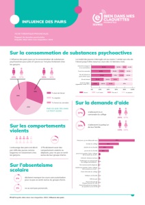 Sur la consommation de substances psychoactives Sur les comportements violents Sur l’absenteisme scolaire Sur la demande d’aide INFLUENCE DES PAIRS L’influence des pairs joue sur la consommation de substances psychoactives pour près d’1 jeune sur 3 et plus fortement chez les garçons. La moitié des jeunes interrogés ont au moins 1 ami(e) qui a bu de l’alcool jusqu’à être saoul au cours des 12 derniers mois. L’entourage des pairs est décrit par 44% des jeunes comme bagarreur et notamment chez les garçons. déclarent manquer les cours sans autorisation pour ne pas se sentir exclus du groupe d’amis. ne se sont pas prononcés. 17% déclarent avoir des comportement violents ou déplacés, pour ne pas se sentir exclus de leur groupe d’amis. Rapport de données provinciales Enquête «Bien dans mes claquettes» 2022 FICHE THÉMATIQUE PROVINCIALES 35% 45% 26% 37% Tu bois de l’alcool Tu vapotes Tu fumes du cannabis 29% 38% 30% PAR CE QUE TES AMIS LE FONT AUSSI 0% 20% 40% 60% 80% 100% Cherché la bagarre et se sont battus Fumé du cannabis Bu de l’alcool au point d’être saoul Bu de l’alcool Fumé du tabac (cigarettes, roulé, CE...) Aucun 1 à 2 amis Plus de 2 La plupart 56.3% 19.7% 9.6% 14.4% 46.8% 13.5% 20.4% 19.3% 50.4% 17% 20.1% 12.5% 18.3% 18.6% 33% 30.1% 19.4% 18.1% 19.5% 43% 17% 8% 6% Personne, je me débrouille seul Ami(e) du collège Adulte de ma famille Jeune de ma famille Jeune du quartier / tribu / village, de la mairie ou d’une... Internet, réseaux sociaux Professeurs ou personnels du collège (surveillants,... Ma communauté religieuse Adulte du quartier / tribu / village, de la mairie ou d’une ... Point d’écoute du collège Médecin de famille SOS écoute Point d’écoute de l’Espace jeunes en ville Point d’écoute de la maison de quartier ou du CCAS 0.2 0.4 0.5 0.5 1.1 1.7 1.9 2.5 3.6 18.5 26.4 36.9 66.8 0.1 0 10 20 30 40 50 60 70 s’adressent à un camarade du collège s’adressent à quelqu’un de leur famille 26% 47% 13% 24% 37% 26% P 1 // Enquête «Bien dans mes claquettes» 2022 / Influence des pairs