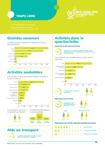 Grandes vacances Activités dans le quartier/tribu TEMPS LIBRE La majorité des jeunes passent leurs vacances à la maison ou dans leurs familles. Les activités les mieux identifiées sont les activités sportives et de loisirs. IDENTIFICATION DES ACTIVITÉS PRATIQUE D’ACTIVITÉS PRATIQUE D’ACTIVITÉS HORS DES HEURES DE COURS Rapport de données provinciales Enquête «Bien dans mes claquettes» 2022 FICHE THÉMATIQUE PROVINCIALES Maison Famille Voyage en NC Voyage hors NC Centre aéré Colonie scout 23.9% 4% 3.9% 56% 30.8% 63.4% 0% 10% 20% 30% 40% 50% 60% estiment l’offre d’activités importante des jeunes ne savent pas quelles activités sont organisées dans leur quartier ou pensent qu’il n’y a rien d’organisé. 41% 41% Sport Activités de loisirs (jeux pêche) Spectacles Activités artistiques et culturelles Activités religieuses Autre 18.1% 12.8% 2.4% 29.3% 18.1% 45.5% 0% 10% 20% 30% 40% 50% 74% 64% 46% 30% 46% 36% 16% 29% participent à une activité durant leur temps libre, dont : Jamais (50%) 2 fois/semaine (16%) Tous les jours (5-10%) Sport Artistique et loisir 69% Activités souhaitées 57% souhaitent pratiquer des activités artistiques, culturelles ou de loisirs et 43% non. Activités culturelles Jeux de plateaux astronomie Activités liés à la protection de... Activités de la paroisse Scoutisme Autre 10.5% 6.1% 0.6% 11.9% 11.3% 17% Aucune Activités artistiques Activités de loisirs 20.8% 18.9% 43.3% 0% 10% 20% 30% 40% 50% Trio de tête des activités physiques ou sportives souhaitées. Ce sont plutôt les garçons qui ne souhaitent pas d’activité. 53% 34% 59% 24% 23% Musculation Sport collectif Sport de combat Aide au transport 38% la prise en charge des frais de transport aiderait à faire plus d’activités. P 1 // Enquête «Bien dans mes claquettes» 2022 / Temps libre