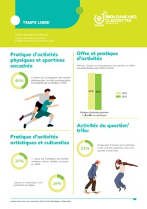 Offre et pratique d’activités Activités du quartier/ tribu Pratique d’activités physiques et sportives encadrée Pratique d’activités artistiques et culturelles TEMPS LIBRE Rapport de données provinciales Enquête «Bien dans mes claquettes» 2025 FICHE THÉMATIQUE PROVINCIALE 2 jeunes sur 5 pratiquent une activité physique dans un club, une association ou encadrée par un adulte en 2025. 1 jeune sur 5 pratique une activité artistique (danse, théâtre, musique) en 2025. Un peu plus d’1 jeune sur 5 participe à des activités proposées dans leur quartier ou leur tribu. Près de 7 jeunes sur 10 pratiquent une activité. Ce chiffre est plutôt stable entre 2022 et 2025. 1 jeune sur 6 participe à une activité de son église. Enquête «Bien dans mes claquettes» 2025 / Fiche Thématique - Temps libre