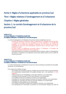 Partie II: Règles d'urbanisme applicable en province Sud Titre I: Règles relatives à l'aménagement et à l'urbanisme Chapitre I: Règles générales Section 1: Le comité d'aménagement et d'urbanisme de la province Sud Article PS 111-1 est créé par Délibération n° 27-2016/APS du 22 juillet 2016 est modifié par Délibération n° 10-2025/APS du 27 mars 2025 (En vigueur) Le comité d’aménagement et d’urbanisme de la province Sud est consulté pour avis sur : - les projets de documents d’urbanisme soumis à l’approbation de l’assemblée de la province Sud, à l’exception des projets issus des procédures de révision simplifiée et de modification simplifiée. Les avis relatifs aux documents d’urbanisme, qui sont rendus par le bureau de l’assemblée de la province Sud conformément au présent code, ne sont pas soumis à l’avis préalable du comité ; - les autres projets de délibération provinciale relatives à l’urbanisme, à l’exception des délibérations portant rectification d’erreurs matérielles ; - toute question qui lui est soumise par son président, dans les matières relatives à l'aménagement du territoire, à l’urbanisme et aux opérations de rénovation urbaine portant sur tout ou partie du territoire provincial. Article PS 111-2 est créé par Délibération n° 27-2016/APS du 22 juillet 2016 est modifié par Délibération n° 10-2025/APS du 27 mars 2025 (En vigueur) Le comité d'aménagement et d'urbanisme de la province Sud est présidé par le président de l'assemblée de province ou son représentant. Il est composé des membres suivants : - trois membres de l'assemblée de province, désignés par cette dernière dans le respect du principe de la représentation proportionnelle des groupes politiques qui y sont représentés, ou leurs suppléants ; - le Haut-commissaire de la République en Nouvelle-Calédonie ou son représentant ; - le président du gouvernement de la Nouvelle-Calédonie ou son représentant ; - le cas échéant, le maire de la commune concernée ou son représentant ; - le président de l’association française des maires de Nouvelle-Calédonie ou son représentant ; - le président de l’association des maires de Nouvelle-Calédonie ou son représentant ; - le président du sénat coutumier ou son représentant ; - le cas échéant, le président de chaque aire coutumière concernée ou son représentant ; - trois représentants des associations de protection de l'environnement désignés par arrêté du