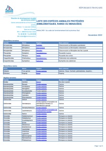 RÉPUBLIQUE FRANÇAISE Centre administratif de la Province Sud (CAPS) Artillerie - 6, route des Artifices Baie de la Moselle BP L1, 98849 Nouméa cedex Tél. 20 30 40 - Fax 20 30 06 3dt.contact@province-sud.nc Famille Genre Espèce Nom commun Miniopteridae Miniopterus australis Chauve-souris ou Minioptère australasien Miniopteridae Miniopterus macrocneme Chauve-souris ou Mminioptère mélanésien Miniopteridae Miniopterus robustior Chauve-souris ou Minioptère des îles Loyauté Pteroptidae Notopteris neocaledonicus Roussette à queue Pteroptidae Pteropus vetula Roussette des roches Vespertilionidae Chalinolobus neocaledonicus Chalinolobe néo-calédonien Vespertilionidae Nyctophilus nebulosus Nyctophile néo-calédonien Ordre Genre Espèce Nom commun Cétacés Tous genres Toutes espèces baleines, Orque, Cachalot, globicéphales, dauphins… Siréniens Dugong dugon Dugong Famille Genre Espèce Nom commun Boidae Candoia bibroni Boa des Loyauté Diplodactylidae Bavayia Toutes espèces Geckos Diplodactylidae Correlophus Toutes espèces Geckos Diplodactylidae Dierogekko Toutes espèces Geckos Diplodactylidae Eurydactylodes Toutes espèces Geckos Diplodactylidae Mniarogecko Toutes espèces Geckos Diplodactylidae Oedodera Toutes espèces Geckos Diplodactylidae Rhacodactylus Toutes espèces Geckos Gekkonidae Gehyra Toutes espèces Geckos Gekkonidae Hemidactylus Toutes espèces à l’exception de Hemidactylus frenatus et Hemidactylus garnotii Geckos Gekkonidae Hemiphyllodactylus Toutes espèces Geckos Gekkonidae Lepidodactylus Toutes espèces à l’exception de Lepidodactylus lugubris Geckos Gekkonidae Nactus Toutes espèces Geckos Scincidae Caledoniscincus Toutes espèces Scinques ou Lézards Scincidae Celastiscinus Toutes espèces Scinques ou Lézards Scincidae Cryptoblepharus Toutes espèces Scinques ou Lézards Scincidae Emoia Toutes espèces Scinques ou Lézards Scincidae Geoscincus Toutes espèces Scinques ou Lézards Scincidae Graciliscincus Toutes espèces Scinques ou Lézards Scincidae Lacertoides Toutes espèces Scinques ou Lézards Scincidae Lioscincus Toutes espèces Scinques ou Lézards Scincidae Lygosoma Toutes espèces Scinques ou Lézards Scincidae Marmorosphax Toutes espèces Scinques ou Lézards Scincidae Nannoscincus Toutes espèces Scinques ou Lézards Scincidae Phoboscincus Toutes espèces Scinques ou Lézards Reptiles terrestres Direction du développement durable des territoires (DDDT) LISTE DES ESPÈCES ANIMALES PROTÉGÉES (EMBLÈMATIQUES, RARES OU MENACÉES) Article 240-1 du code de l’environnement de la province Sud Novembre 2023 Mammifères terrestres Mammifères marins Page 1 sur 5